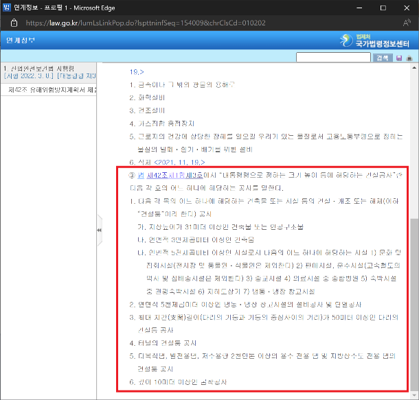 산업안전보건법 시행령 제42조 (유해위험방지계획서 대출대상) ③항을 보면, 대통령령으로 정하는 크기 높이 등에 해당하는 건설공사의 목록이 나와있습니다. 이에 해당하는 건설공사의 사업주는 유해위험방지계획서를 작성해서 고용노동부장관에게 제출하고 심사를 받아야 합니다.