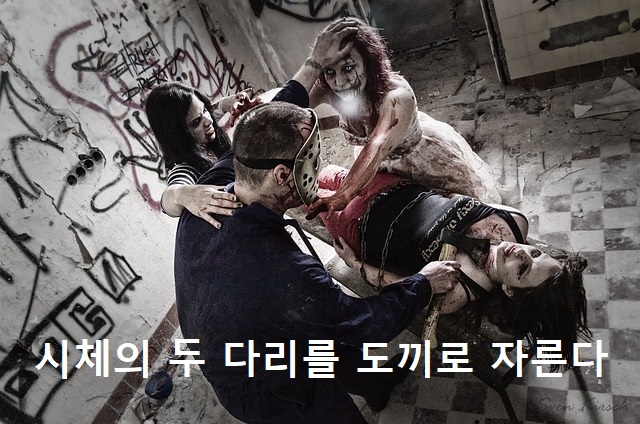 '좀비 시체의 두 다리를 도끼날(V)로 찍어 자른다'